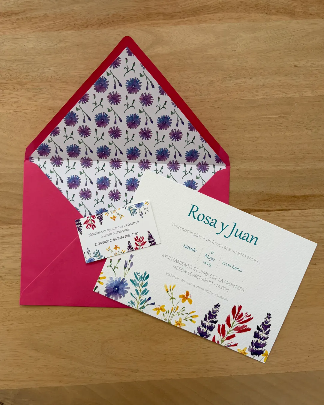 Nuestra invitación de boda en acuarela pintada a mano es perfecta para parejas que buscan una papelería elegante, natural y con un toque artístico para su gran día. Este diseño combina delicadas ilustraciones florales realizadas en acuarela a mano, creando una composición fresca y romántica inspirada en flores silvestres que aporta color sin perder la armonía visual.