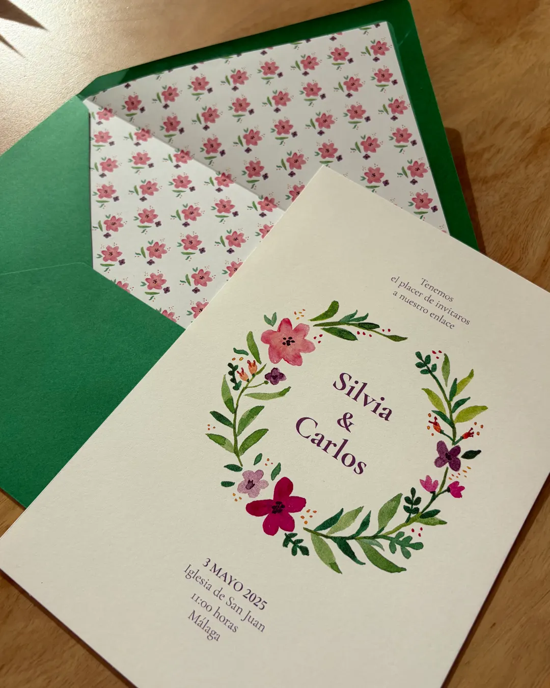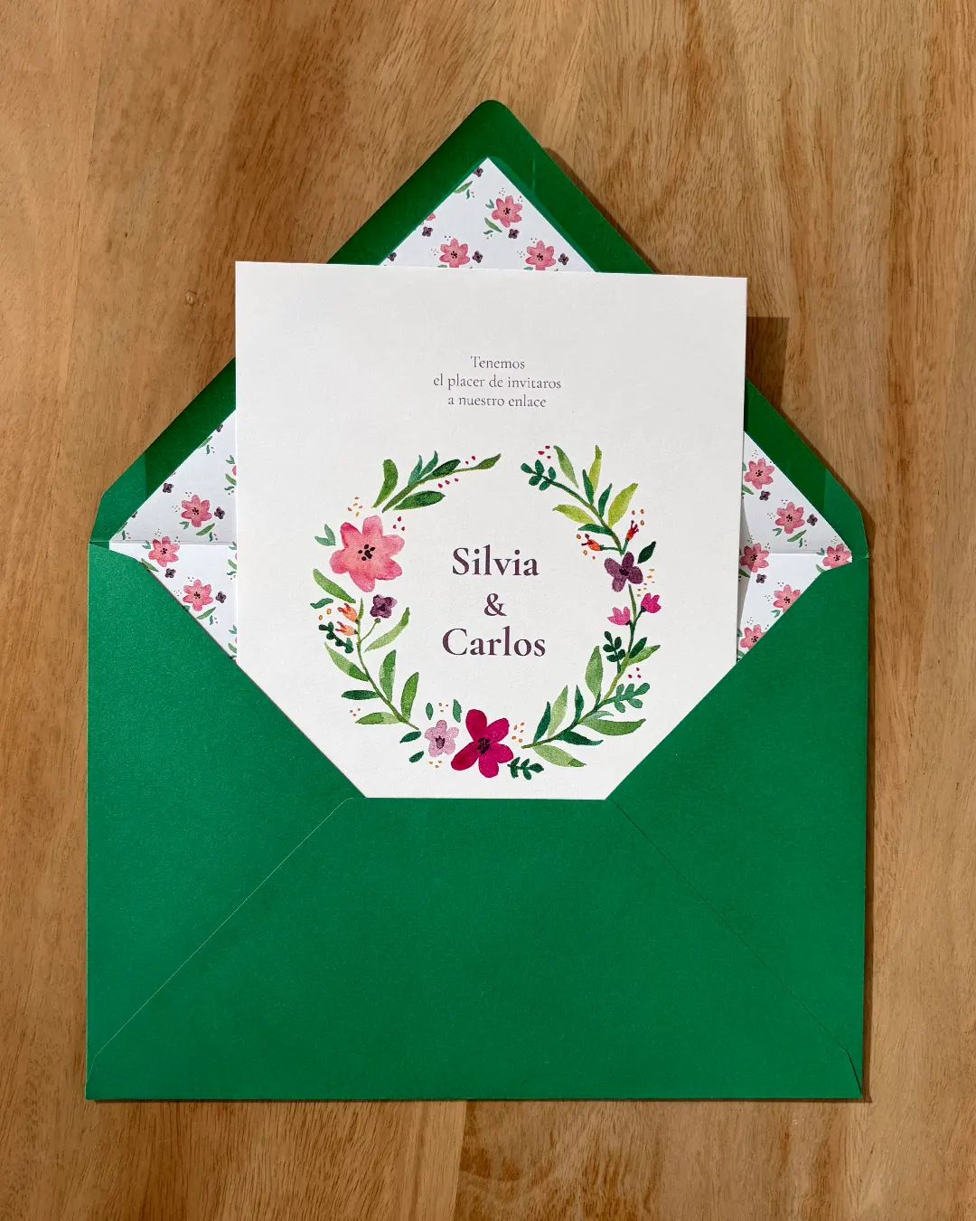 La corona de flores, de inspiración silvestre, crea un efecto envolvente que simboliza unión y celebración. Es una invitación de boda floral pensada para parejas que buscan un diseño elegante pero cercano, con un aire artesanal y un acabado cuidado en cada detalle.