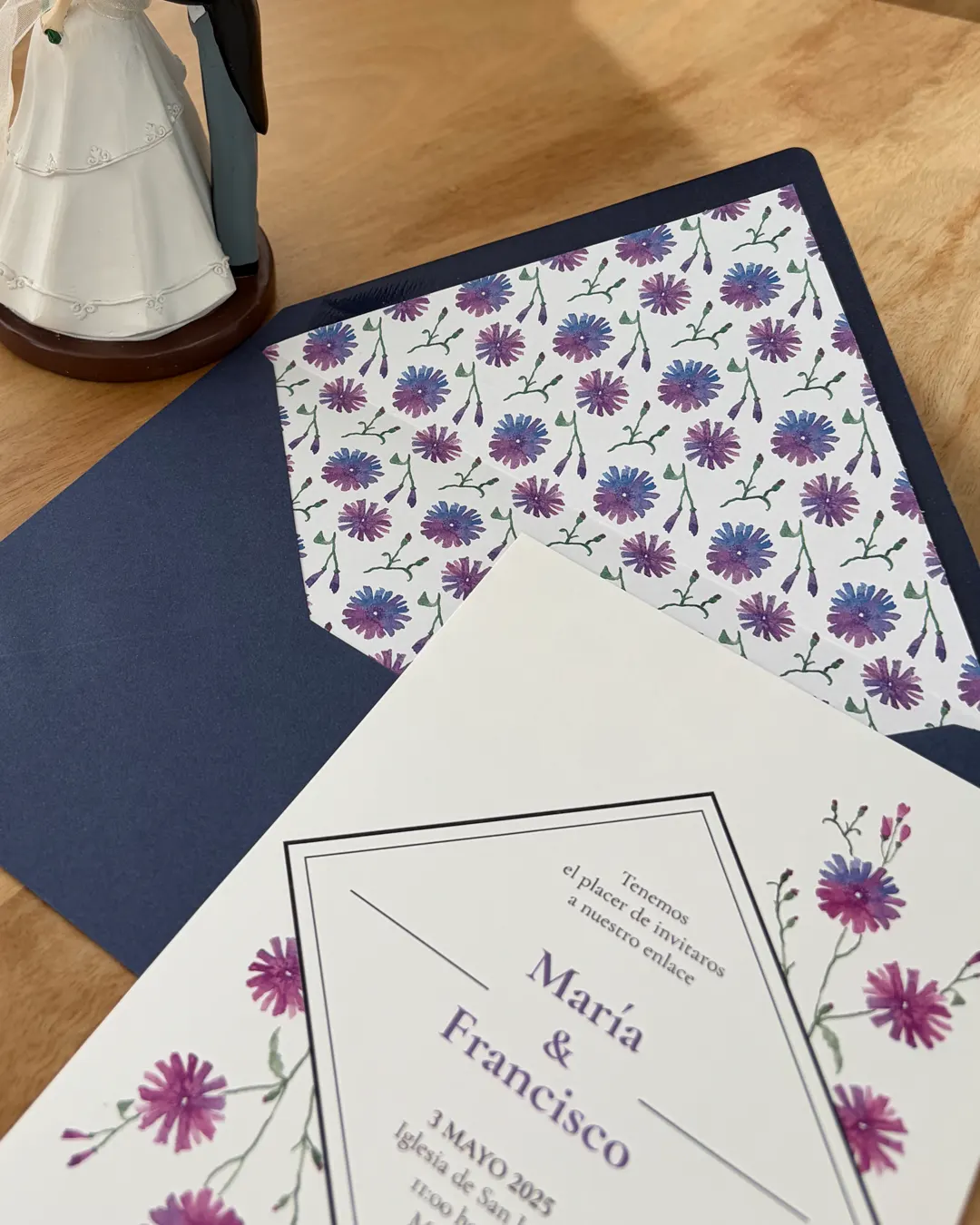 Esta invitación de boda combina elegancia geométrica y delicadeza floral en un diseño equilibrado y sofisticado. El marco en forma de rombo estructura la composición y enmarca los nombres de los novios, mientras que las flores en tonos morados, realizadas en acuarela hecha a mano, aportan naturalidad, frescura y un acabado artístico único.